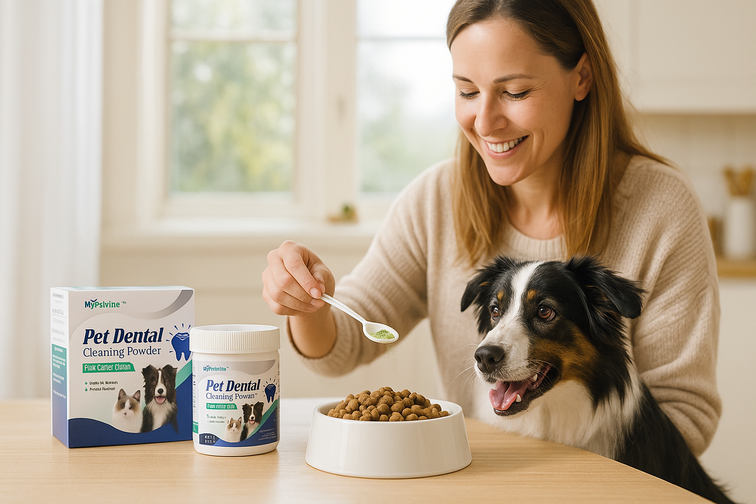 Simply sprinkle MyPetVibe Dental Powder on your pet’s food once a day — that’s it.
